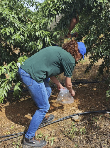 A mediados de junio, en el momento óptimo, el equipo de CTAEX ha visitado la parcela de almendros de C. HIDALGO en la que se está desarrollando el ensayo de fertiirrigación con la fase líquida del purín, para la recogida de muestras de suelo y foliares, con fines analíticos. Los resultados de estos análisis serán los indicadores del grado de desarrollo de las plantas.